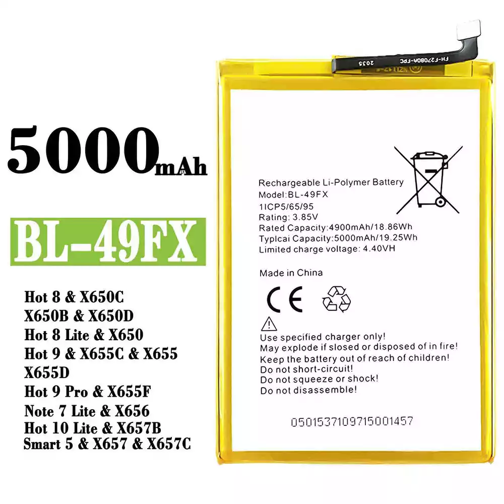 Batería BL-49FX para Infinix Hot 8 / X650C / X650B / X650D /Hot 8 Lite / X650 / Hot 9 / X655C / X655 / X655D / Hot 9 Pro / X655F / Note 7 Lite / X656 / Hot 10 Lite / X657B / Smart 5 / X657 / X657C